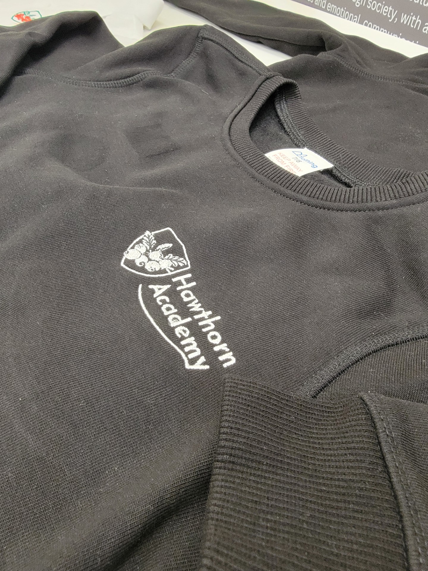 Our school uniform is a black sweatshirt with the Hawthorn Academy logo (available to order from My Clothing), a white polo shirt (with or without logo, also available from My Clothing), grey trousers or skirt, and plain black shoes. PE shirts are black with the Hawthorn Academy logo, also available from My Clothing. Shorts or jogging bottoms are required for PE, in either black or navy.